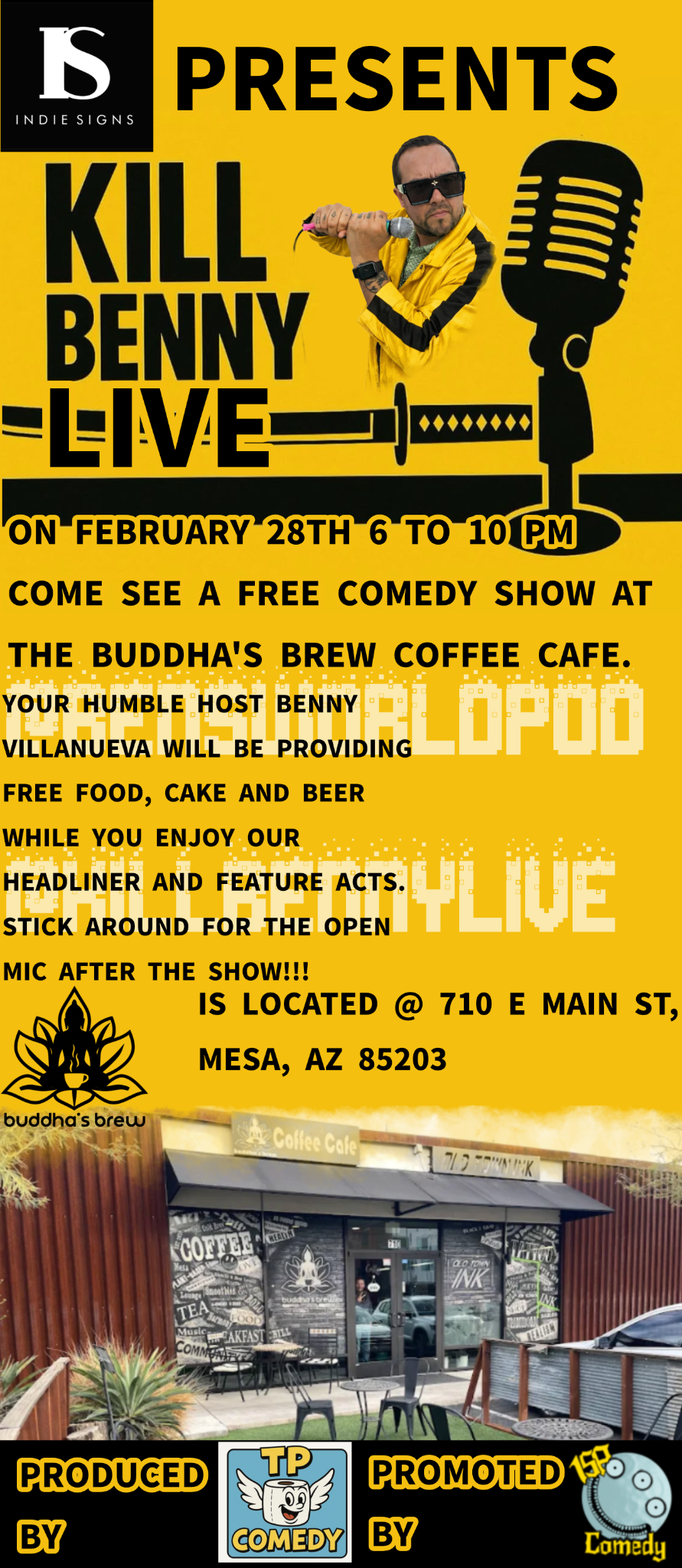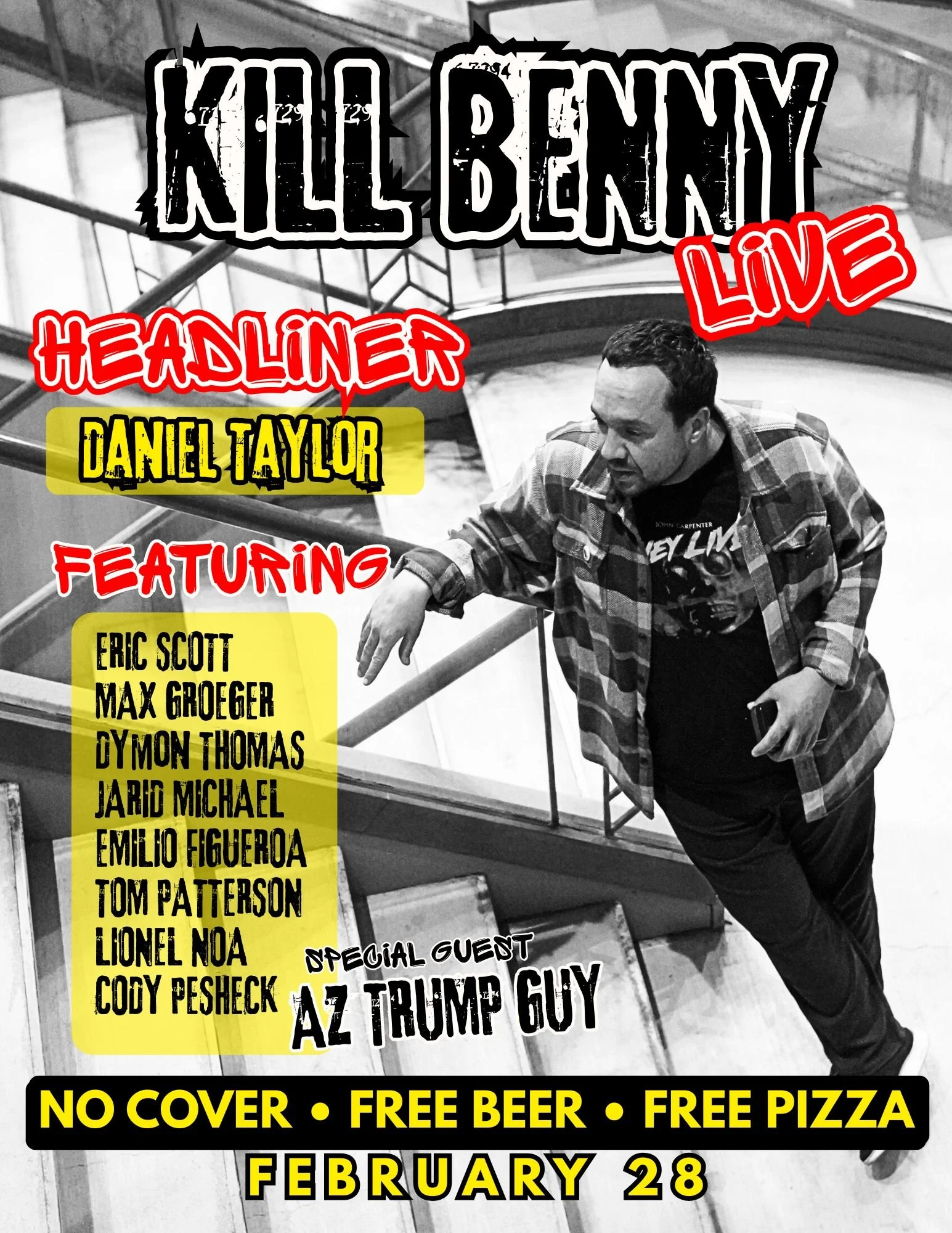 WELCOME TO KILL BENNY LIVE HQ. RULE NUMBER 1 THERE IS NO KILL BENNY LIVE. RULE NUMBER 2 NEVER GO FULL TONY HINCHCLIFFE. RULE NUMBER 3 WE REWARD LOYALTY WITH LOYALTY SO PERFORM THE OPEN MIC AND GRADUATE TO PAID FEATURE SPOTS. FREE COMEDY SHOW FOR THE AUDIENCE! FREE BEER FREE PIZZA FREE CAKE! SCROLL DOWN FOR MORE!!!